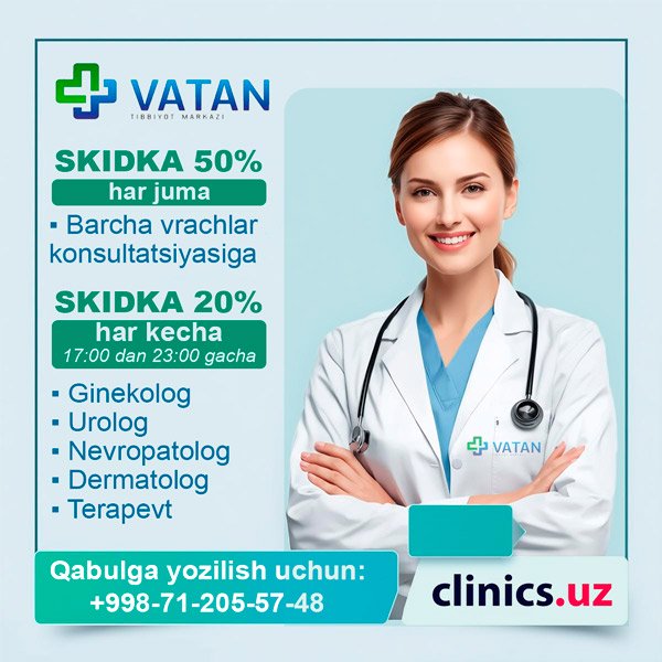 SKIDKA 50% vrachlar konsultatsiyasiga HAR JUMA va 20% har kechga Vatan Tibbiyot Markazida