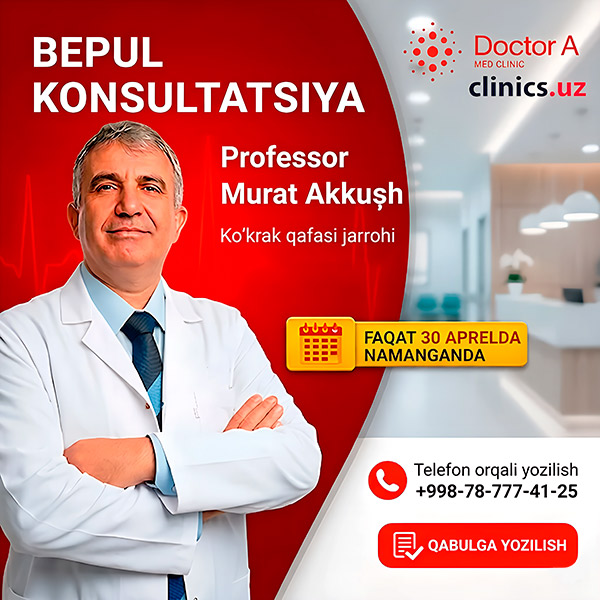 Namanganda 30-aprel kuni Doctor A klinikasida Turkiyaning yetakchi ko‘krak qafasi jarrohlaridan biri — professor Murat Akush qabul olib boradi.